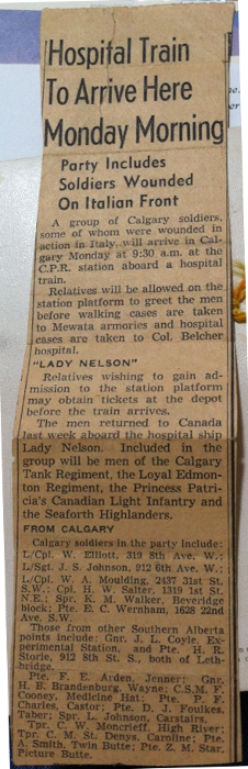 This clipping, showing Bill's return aboard the HMCS Lady Nelson hospital ship, was found carefully folded amongst Esther's papers.