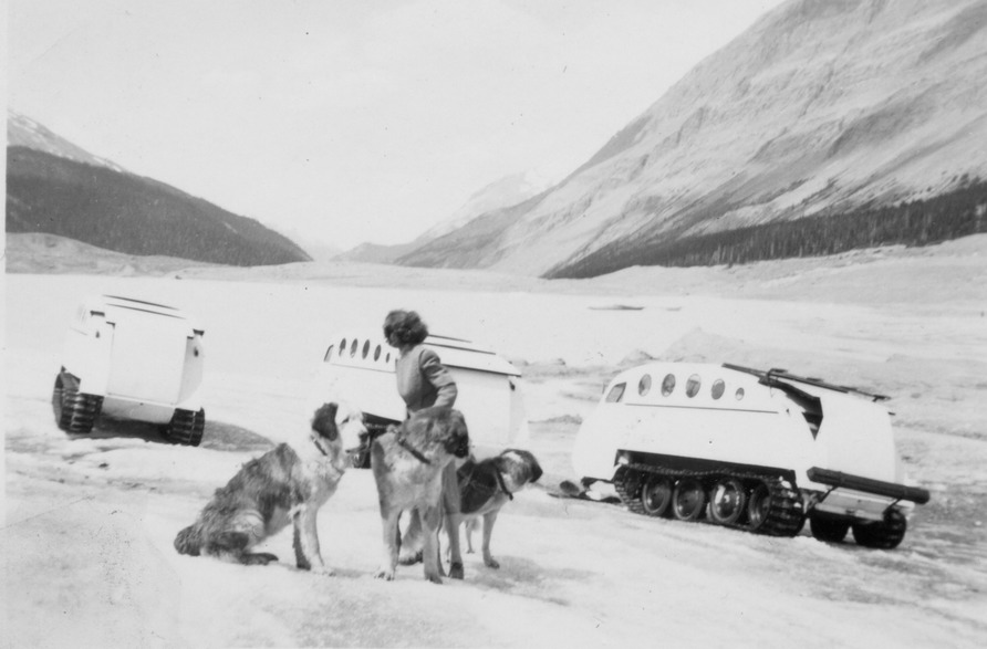 My wife and I traveled by pickup truck, loaded with four grown St. Bernard dogs and four young pups, down the Banff-Jasper Highway, a vastly different road from today's beautiful highway. It was hot weather in early July 1951, and when we got to the Columbia Icefields we let the dogs out to cool off.[2] The ice in those days was right down to the road. The dogs enjoyed a run on the ice but we had a job getting them loaded again; the many tourists wanted to photograph them as they thought the dogs were there for training in rescue work.