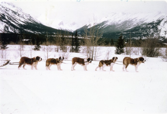 The St. Bernards could run very fast if given enough incentive, such as when I would run across a band of wild horses on the plains. The horses were very inquisitive, and when they saw us would stand with pointed ears till we got quite close and then they would take off. There would be no restraining the dogs; they would take off after the horses and I would get a wild ride on the back of the toboggan and riding the brake till I slowed them a bit, and the horses out-distanced us.