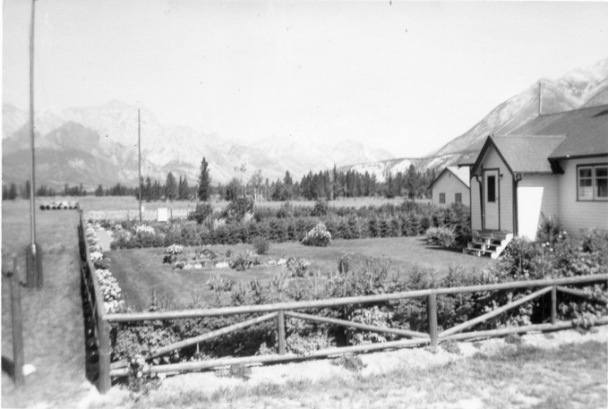 As time went on I improved the station grounds so that I had beautiful grounds and garden. In that lovely climate I could grow things I cannot grow now at Rocky Mountain House. Although the altitude was four thousand five hundred feet and deep on the mountains, it was frost-free from mid-May to mid-October; very dry of course, and we had to keep water sprinklers going every day. Hunters used to be amazed to come out there in the fall and see flowers blooming while outside all would be dead.