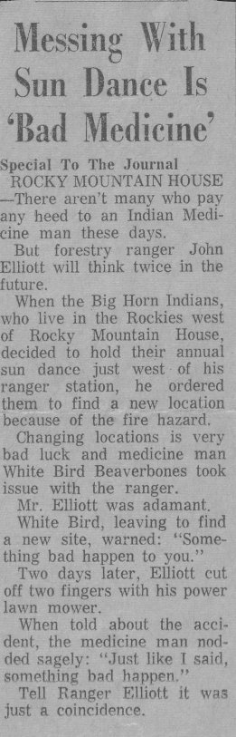 From The Edmonton Journal, date unknown Messing With Sun Dance Is 'Bad Medicine'Special To The Journal - ROCKY MOUNTAIN HOUSEThere aren't many who pay any heed to an Indian Medicine man these days. But forestry ranger John Elliott will think twice in the future. When the Big Horn Indians, who live in the Rockies west of Rocky Mountain House, decided to hold their annual sun dance just west of his ranger station, he ordered them to find a new location because of the fire hazard. Changing locations is very bad luck and medicine man White Bird Beaverbones took issue with the ranger. Mr. Elliott was adamant. White Bird, leaving to find a new site, warned: "Something bad happen to you." Two days later, Elliott cut off two fingers with his power lawn mower. When told about the accident, the medicine man nodded sagely: "Just, like I said, something bad happen."