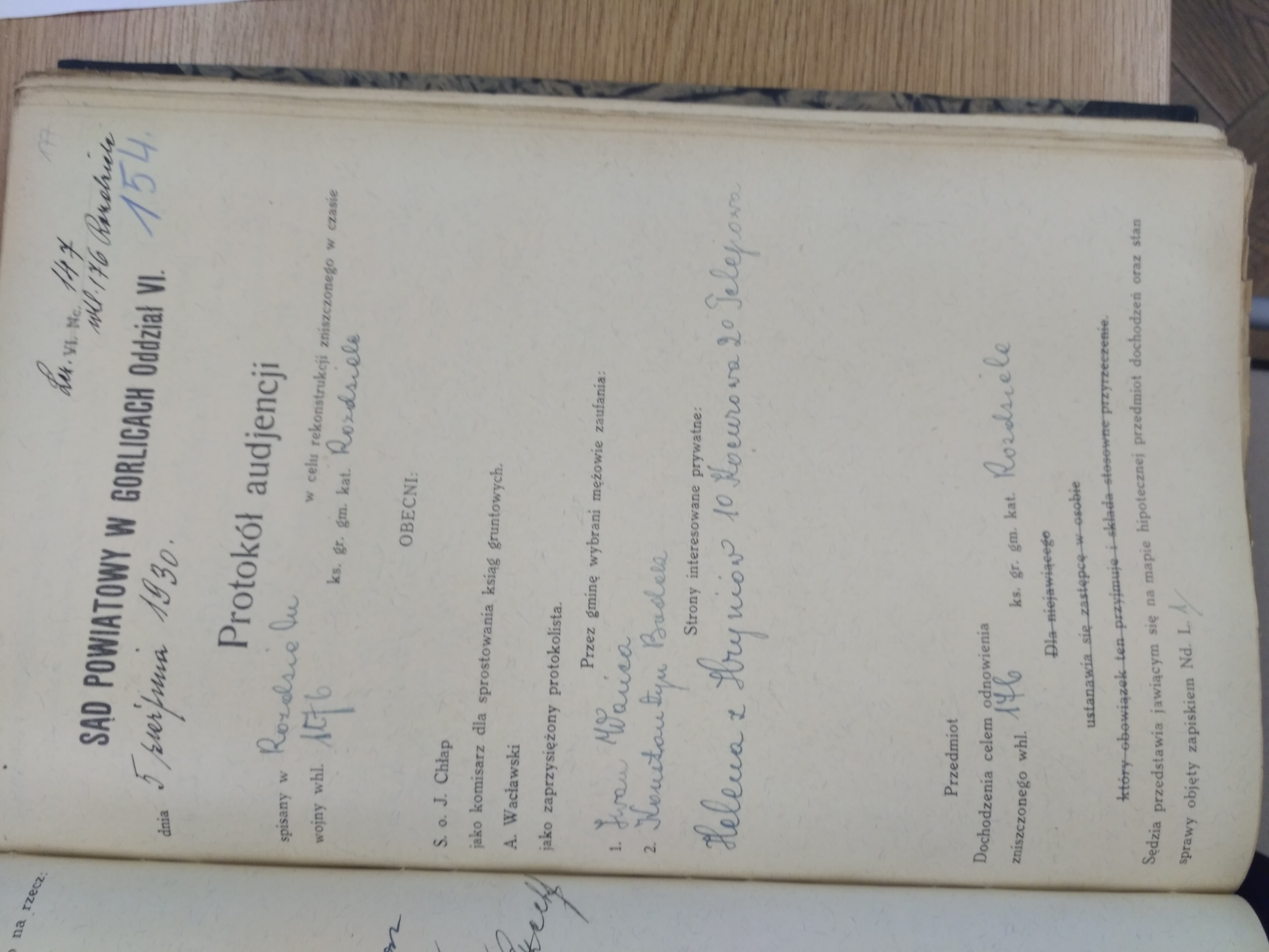 Protokól audjencji spisany w Rozdzielu w celu rekonstrukcji zniszczonego w czasie wojny whl. 176 ks. gr. gm. kat. RozdzieleMinutes of a hearing written in Rozdziele concerning the reconstruction of wartime damage to property 176, commune land register of Rozdziele