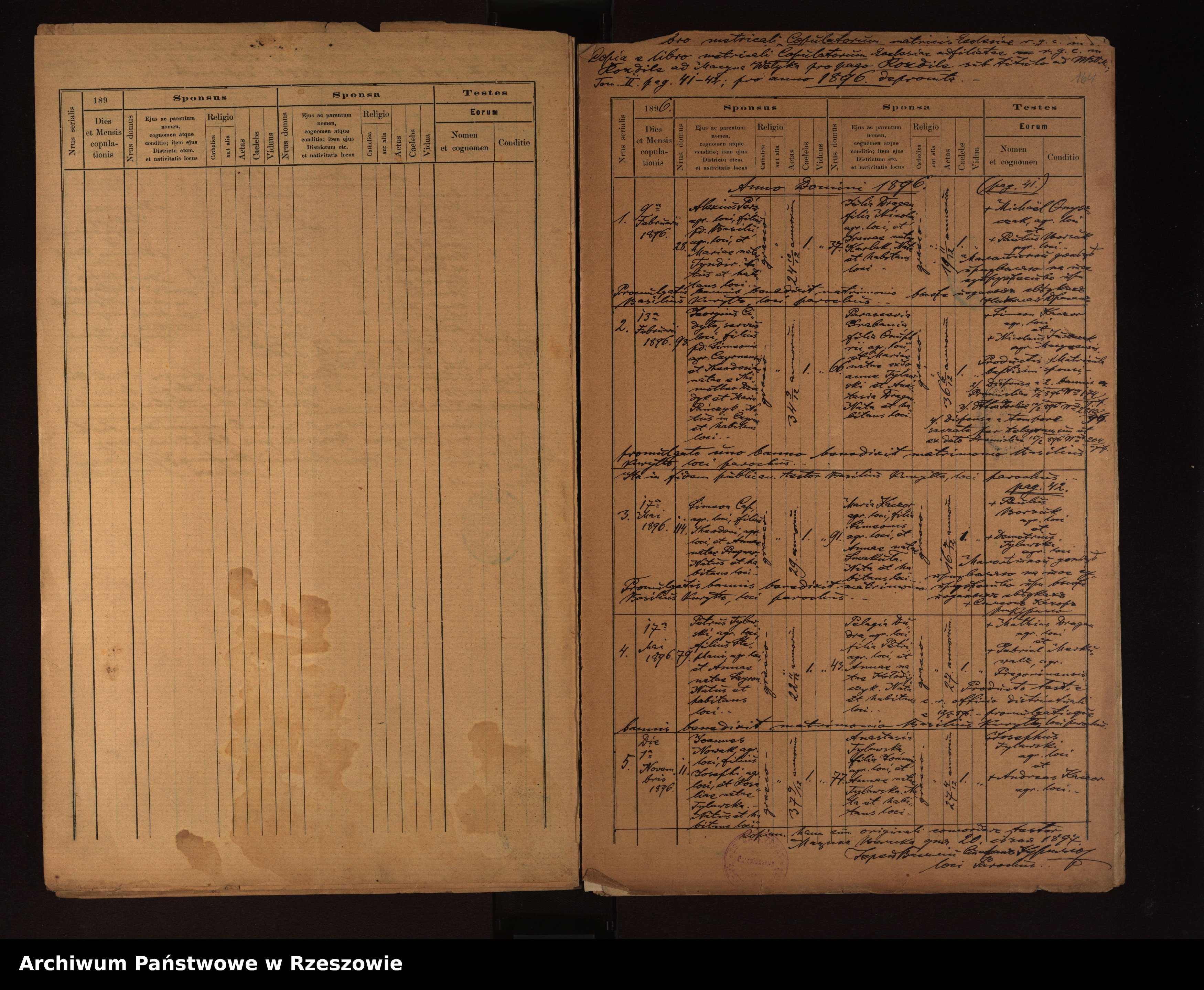 | 5 | 1896.11.01 | Rozdziele | 11 | Joannes Nowak | 37 9/12 | 77 | Anastasia Tylawski | 27 4/12 | Josephus Nowak | Rosalia Tylawska | Joannes Tylawski | Anna Tylawska |