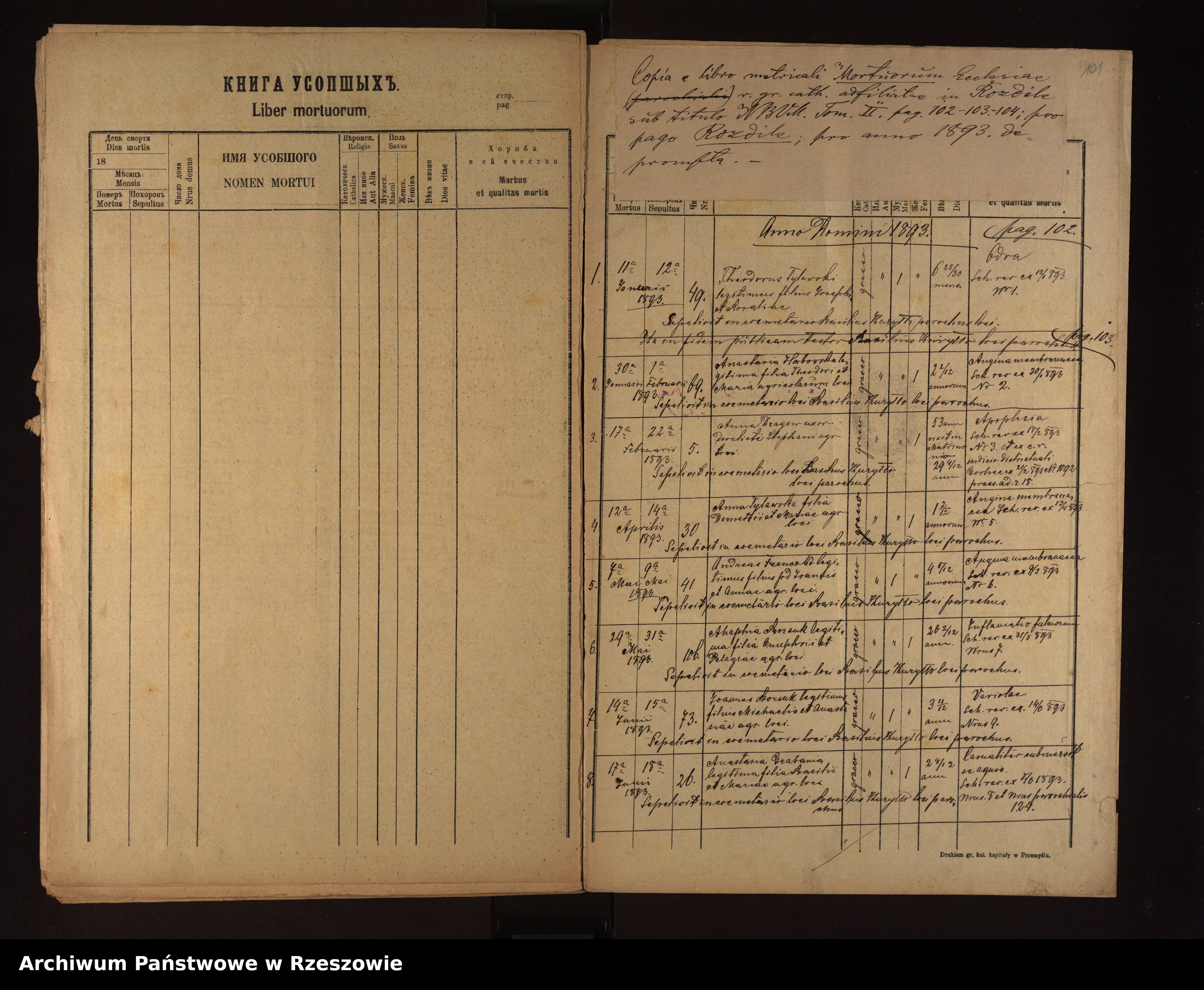 | 5 | 1893.05.07 | Rozdziele | 41 | Andreus Frenczko | Catholic | male | 4 5/12 | Angina membranosa | Joannes Frenczko | Anna Frenczko | ||