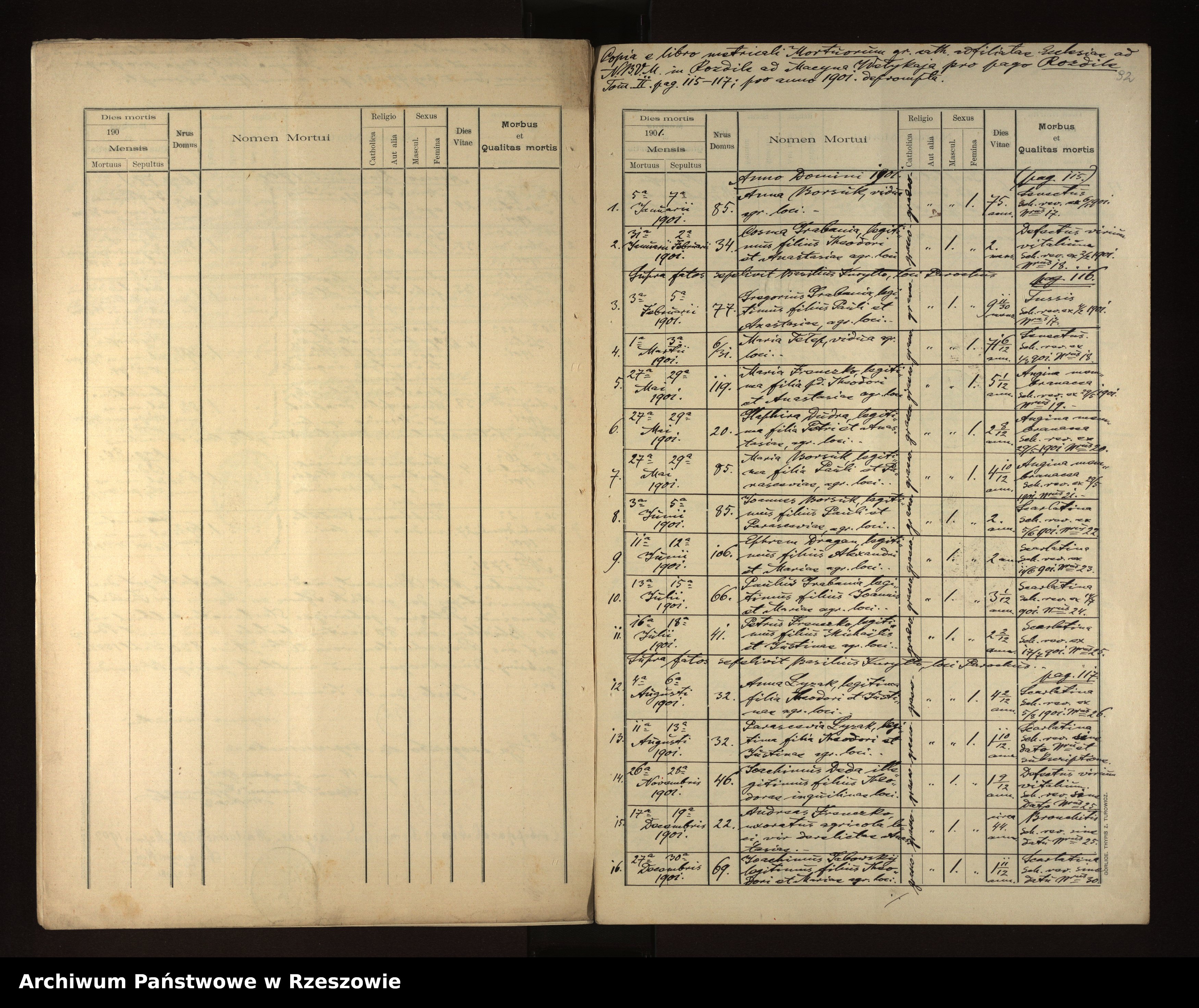 | 16 | 1901.12.27 | Rozdziele | 69 | Joachimus Gabowski | Catholic | male | 1 11/12 | scarlatina | Joannes Gabowski | Anastasia Gabowski |