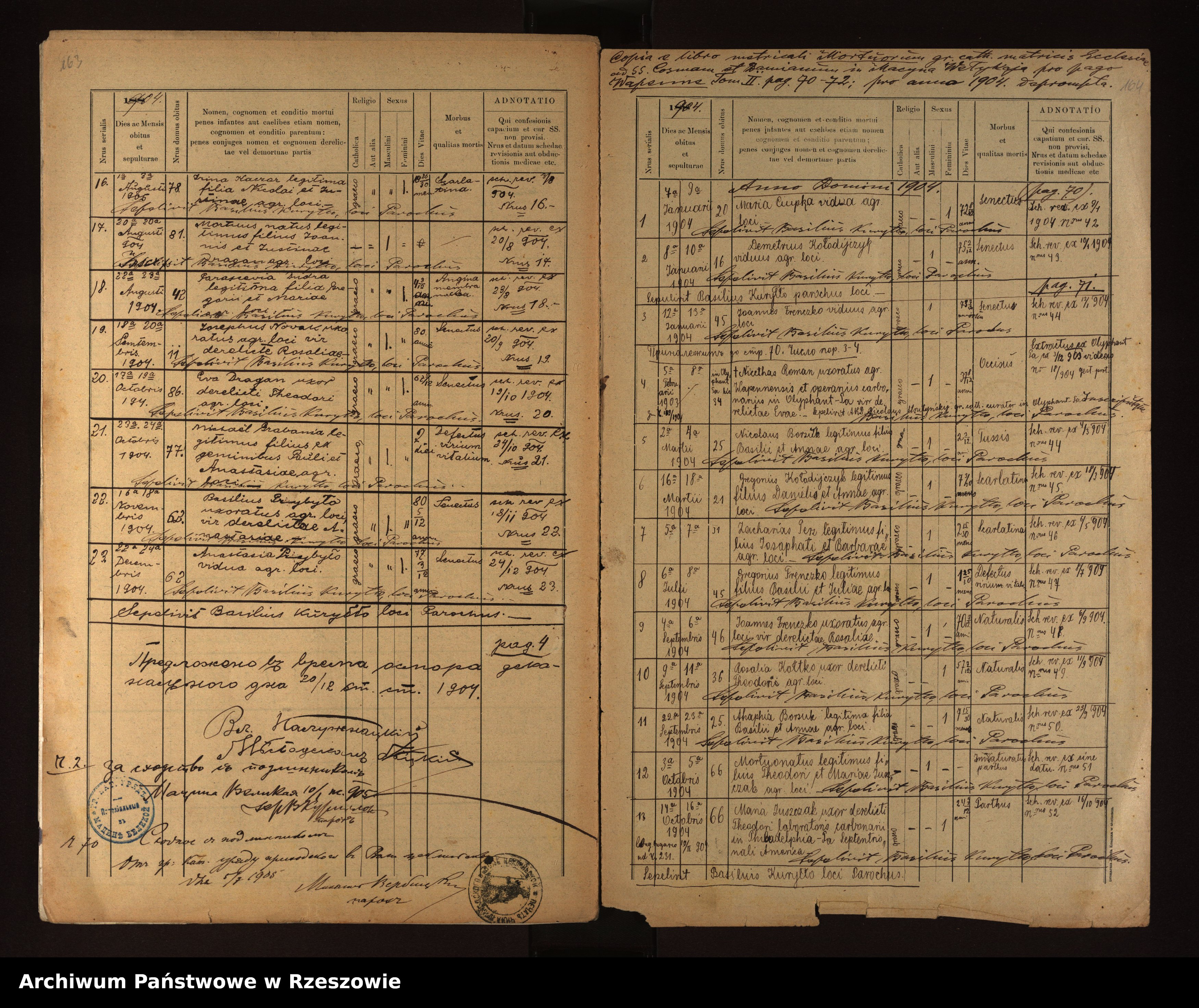 | 3 | 1904.08.22 | Rozdziele | 42 | Parascevia Dudra | Catholic | female | 4 3/12 | Angina membranaclea | Gregorius Dudra | Maria Dudra |