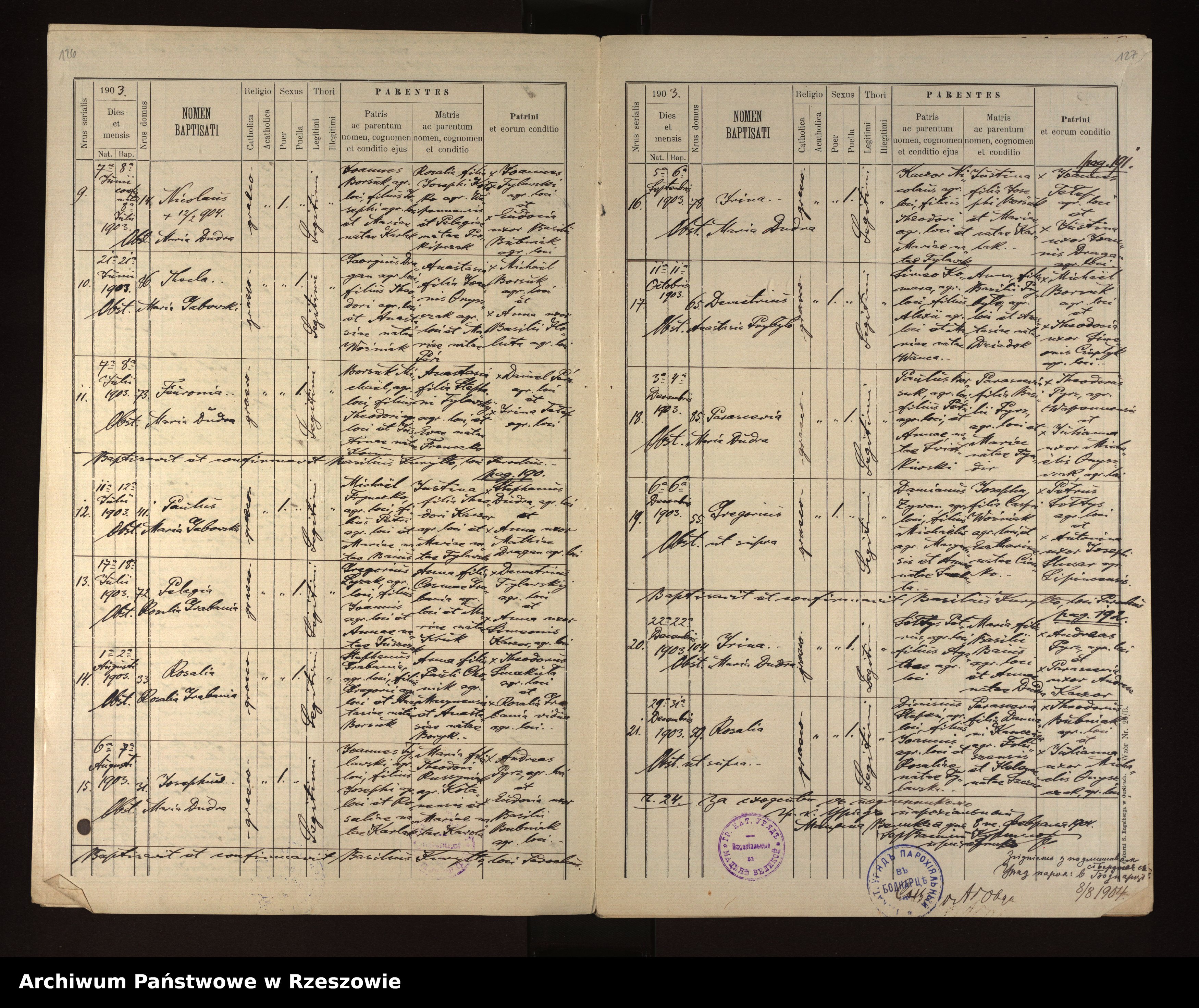 | 1 | 1903.06.07 | Rozdziele | 14 | Nicolaus Borsuk | Catholic | male | Joannes Borsuk | Rosalia Kołtko | ||