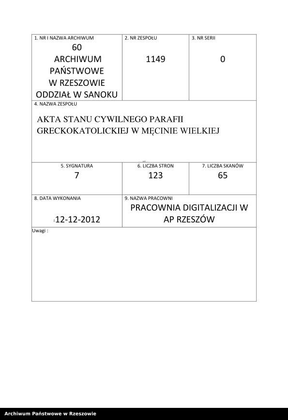 Metrical Records for the Greek Catholic Parish of Męcina Wielka, 1835-1902
