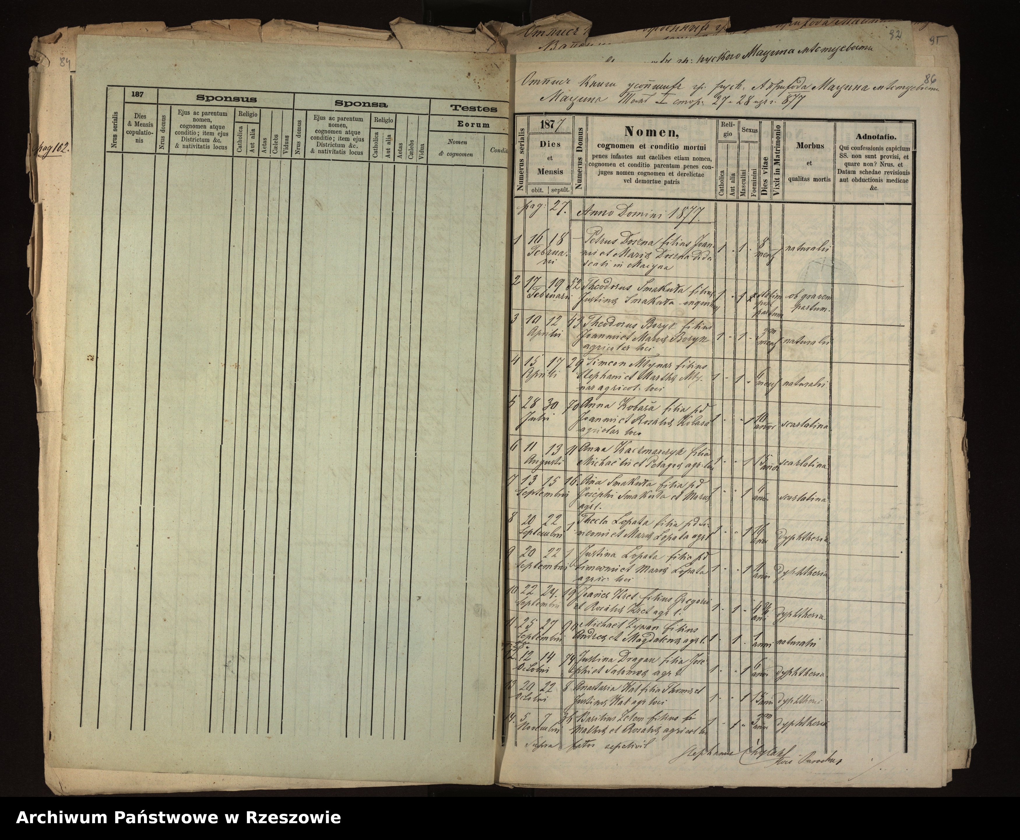 | 10 | 1877.09.22 | Męcina Wielka | 19 | Joannes Kret | Catholic | male | 4 3/4 | dyphtheria | Gregorius Kret | Rosalia Kret |