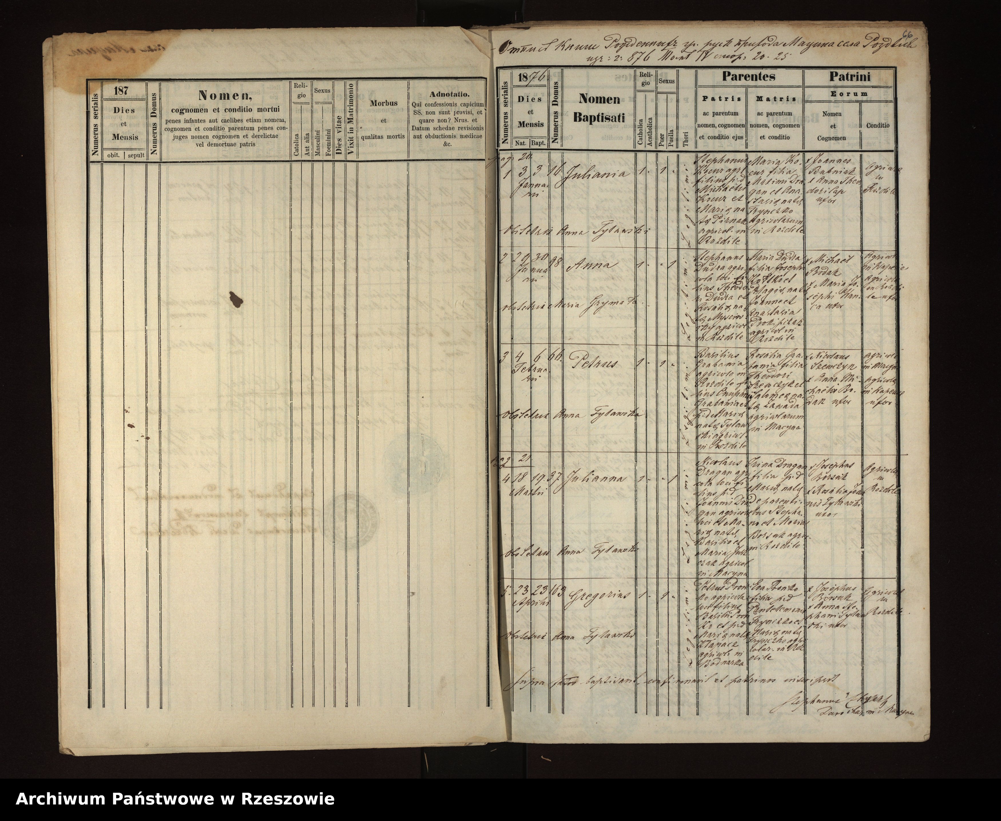 | 1 | 1876.01.03 | Rozdziele | 16 | Juliania Kocur | Catholic | male | Stephanus Kocur | Maria Dragan | ||