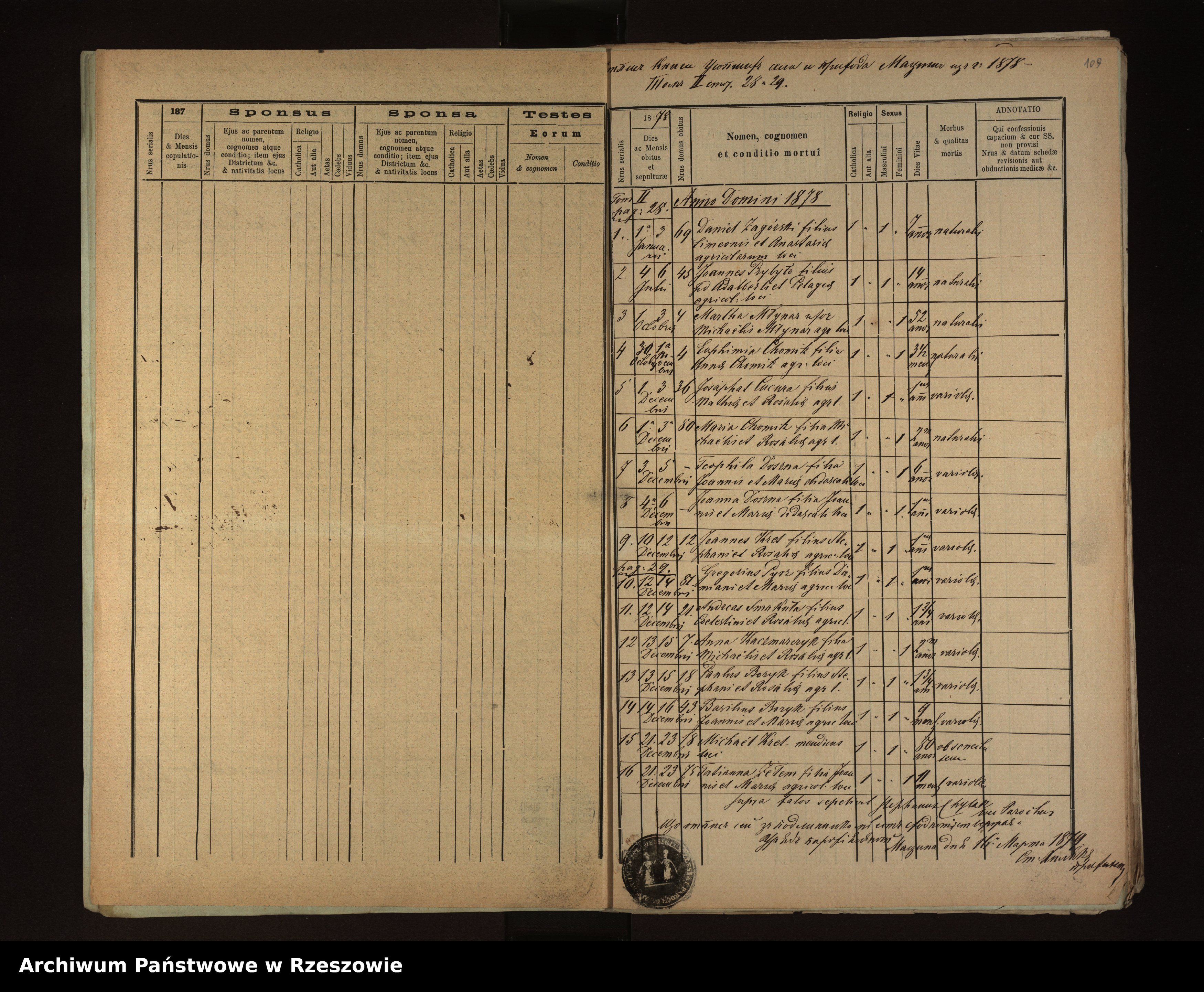 | 16 | 1878.12.21 | Męcina Wielka | 75 | Tatianna Zelem | Catholic | female | 11m | variola | Joannes Zełem | Maria Zełem |