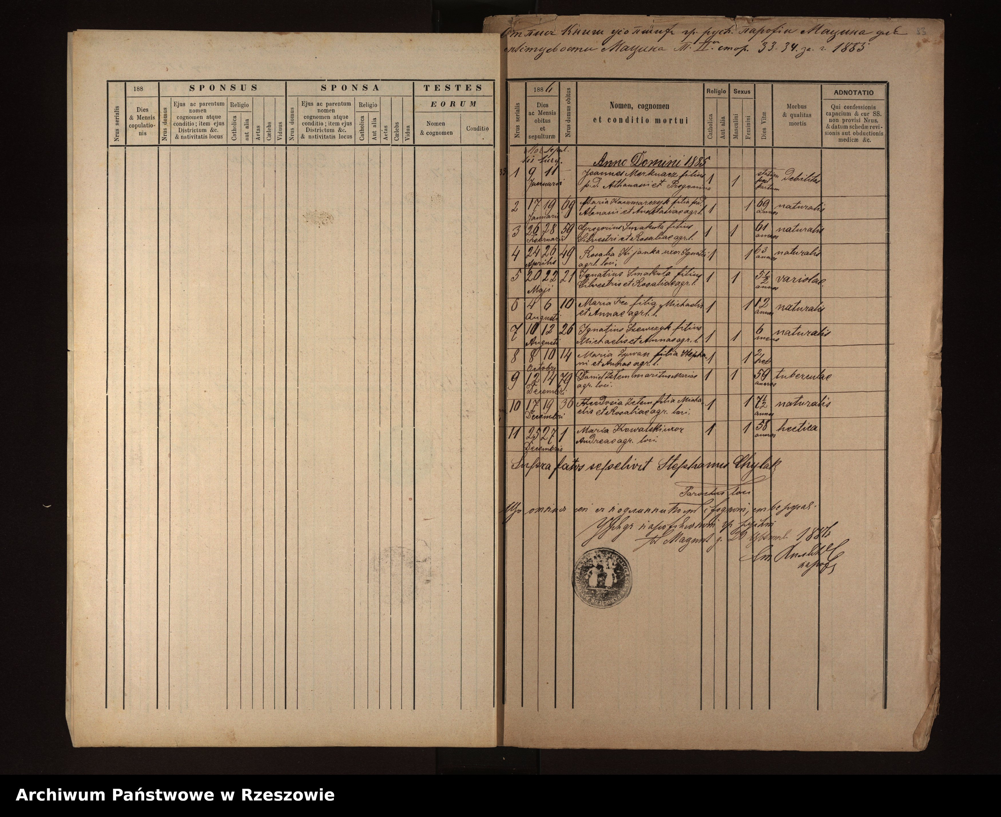 | 11 | 1885.12.25 | Męcina Wielka | 1 | Maria Kowalski | Catholic | female | 58 | hectica | Andreas Kowalski |