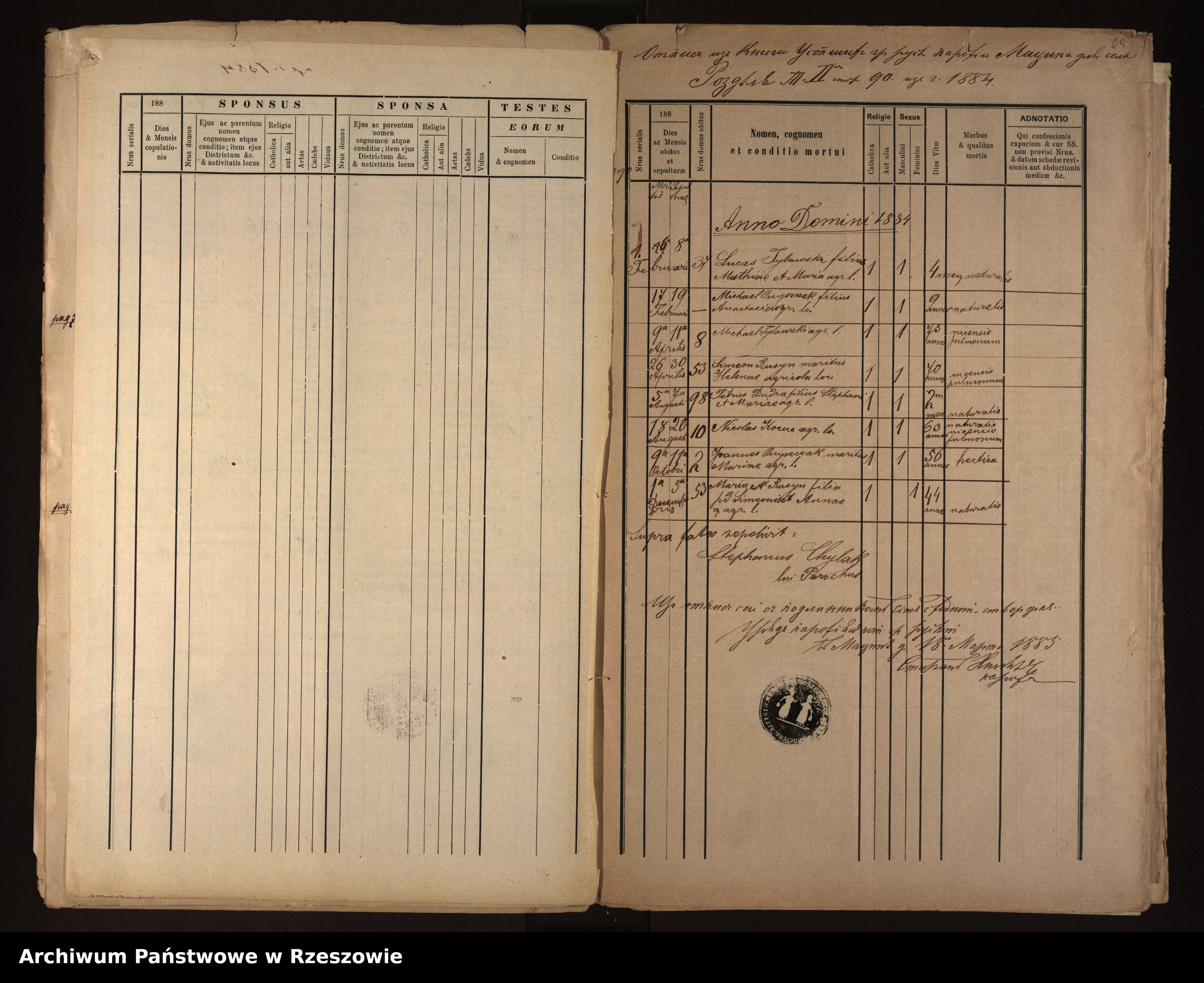 | 7 | 1884.10.09 | Rozdziele | 2 | Joannes Onyszczak | Catholic | male | 56 | hectica | Maria Onyszczak | |||