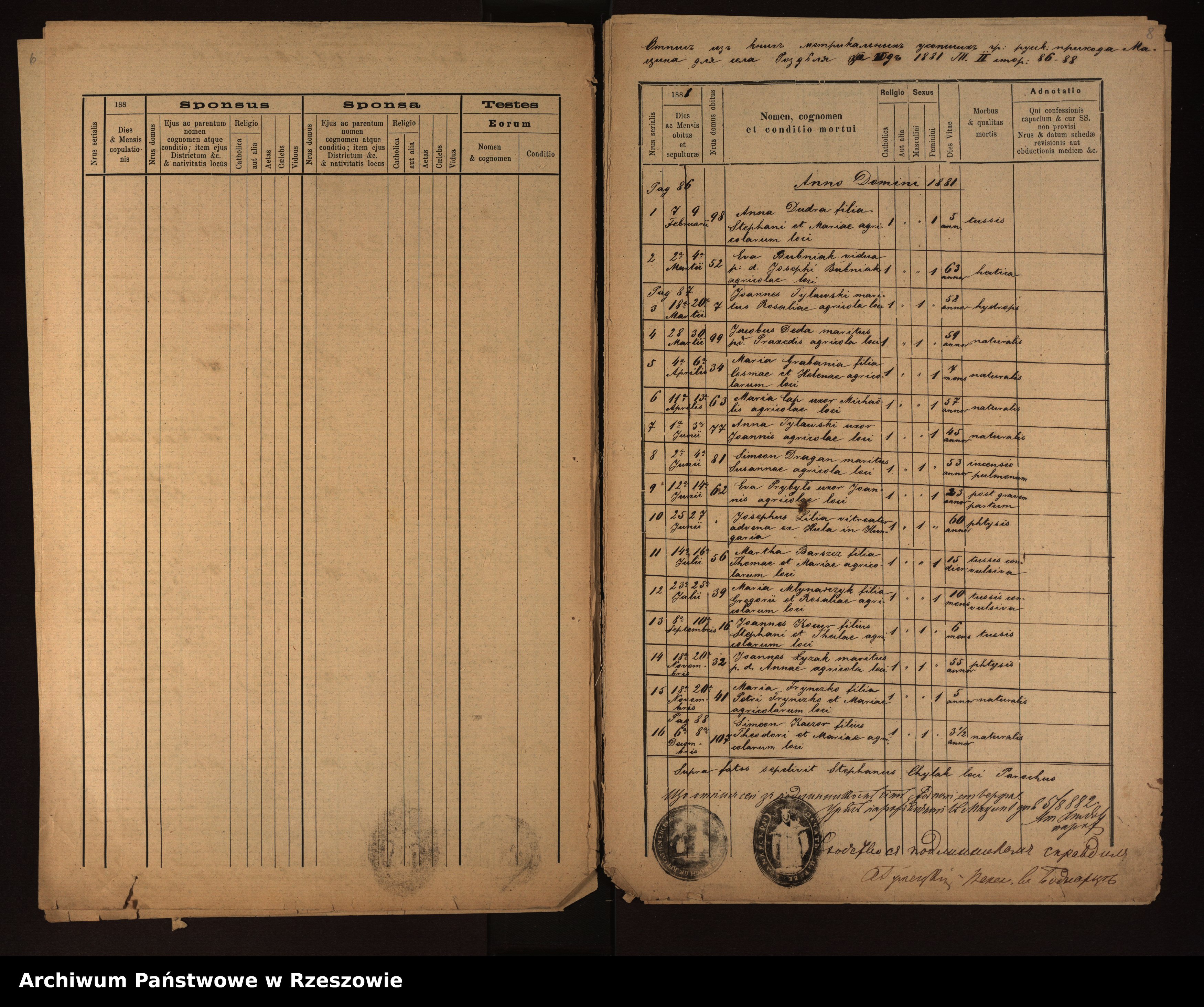 | 13 | 1881.09.08 | Rozdziele | 16 | Joannes Kocur | Catholic | male | 6m | tussis |